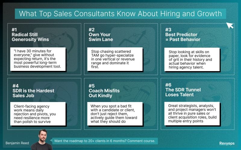 The Language That Multiplies Your Rates Most of your business ideas, plans, and actions are probably wrong. That sounds harsh, but it’s been true for me over and over again. Most of my ideas have failed, especially in the beginning. ![]() | The Real Game in Business: Fast ExperimentsEvery GTM agency founder I know who's scaled past $5M has one thing in common. They didn't figure it out alone. They found a consultant who'd done it before. They joined a mastermind with other agency owners.![]() |